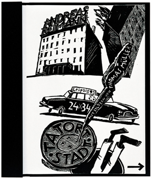 Mit Bildern [Holzschnitten] von Thomas (Matthaeus) Müller 1995 11 Bl. als Leporello 50 num. und sign. Exemplare Holzschnitte (Schriftgrafik und Bilder), Gesamtgestaltung: Thomas Matthaeus Müller Druck der Holzschnitte: Matthias Kleindienst, Leipzig