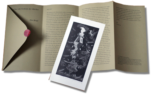 4 S., 122 x 230 mm, Leporellofaltung. Mit einem beiliegendem signierten Steindruck von Rolf Münzner. Die Gestaltung und den Satz in der Walbaum übernahm Sabine Golde, den Textdruck auf Surbalin ockergrün von Peyer, 115 g/qm, die Firma Handoffest, Taucha. Der Druck der Graphik wurde im Lithographischen Atelier von Stefan Rosentreter auf Albrecht-Dürer-Bütten der Firma Römerturm ausgeführt. Der Druck, herausgegeben von Herbert Kästner, erscheint anläßlich der Tagung der Maximilian-Gesellschaft vom 19. bis 21. April 2012 in Leipzig. Auflage 300 numerierte Exemplare.